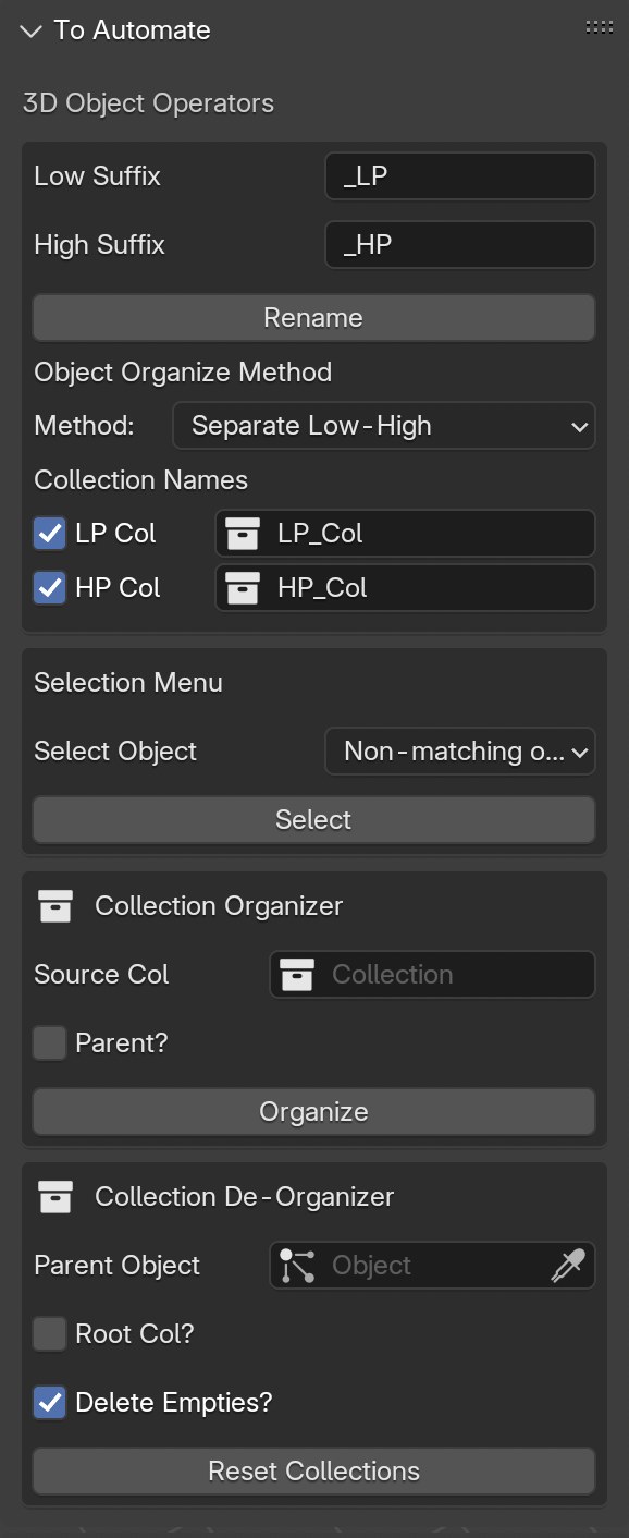 Organize Menu: It moves the Low-poly and High-poly objects into their respective collection.Selection Menu: Helps Checking if `Low and High objects have their respective counter-part.Collection Organizer: Organizes the Blender Collection Heirarchy and creates respective empty-parent heirarchy useful when exporting to softwares like max and game engines.Collection DeOrganizer: Deorganizes the Empty-parent Heirarchy and Converts it to Blender Collection System.