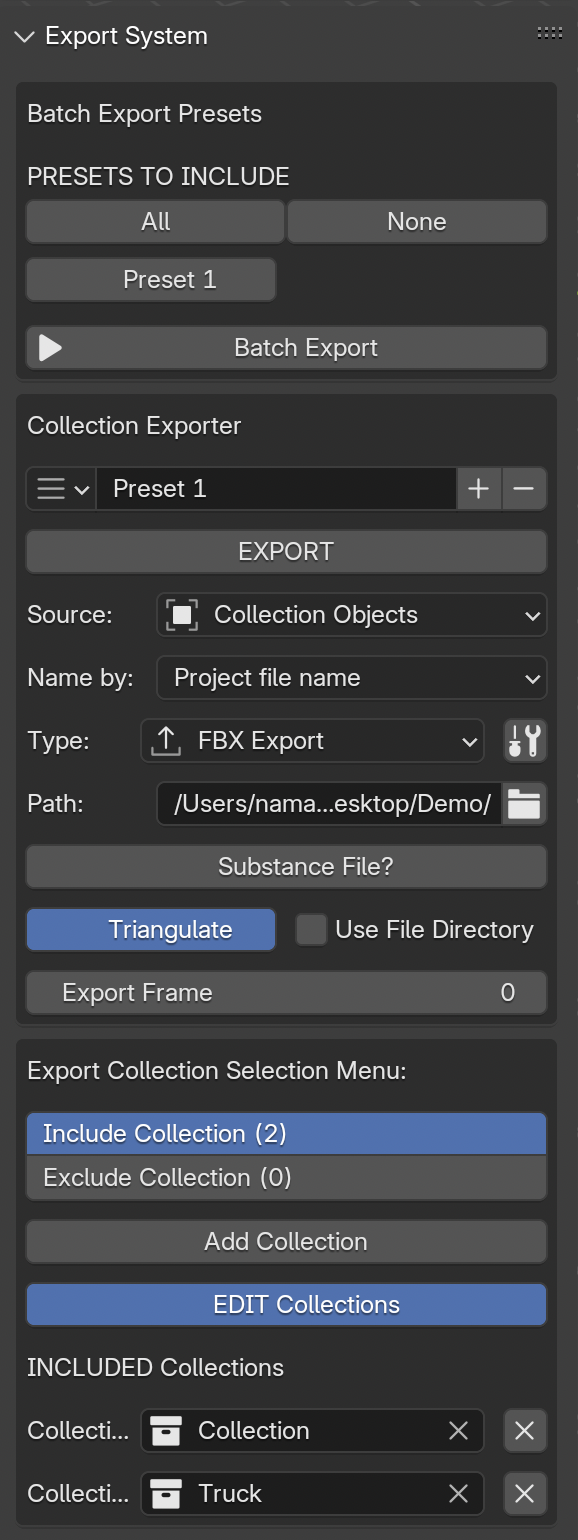 - Option to pre-define preset for Export settings for different types (FBX, USD, OBJ, DAE).