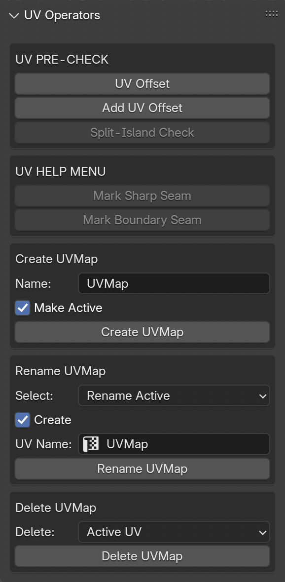 Add UV Offset: Adds UV offset to selected objects' modifiers: Array and MirrorSplit Island Check: Not perfect, But checks if there are any islands that are split.Seams Menu: Mark Boundary of selected faces as seam, or mark sharp edges as seam