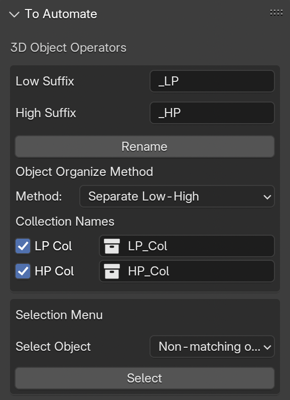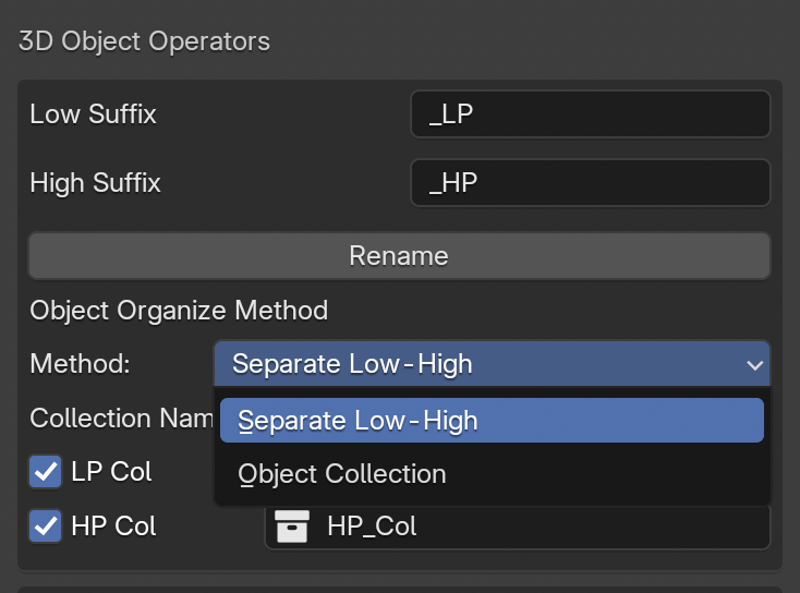 High_name = Low_object_name + high_suffix Properties:Low Suffix: Suffix for low poly object.High Suffix: Suffix for low poly object.LP Col: Name for the Collection to store low poly objects. [ToggleONto move respective objects to this collection, ]HP Col: Name for the Collection to store high poly objects. [ToggleONto move respective objects to this collection, ]