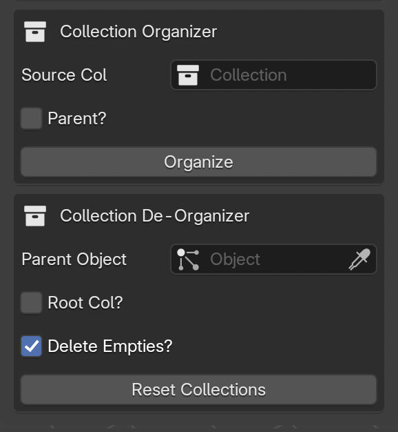 4. Collection Organizer: Converts the Blender's Collection Heirarchy to Empty object-parent collection for the collection tree, Helpful when want to preserve heirarchy for .fbx or other 3D softwares.