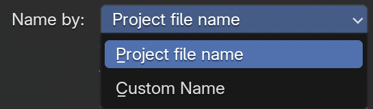 Project File name: Export the resulting file asBlend_file_name.fbx, Condition being Blend file must be saved in a directory.Custom File Name: Brings out a name field for the export file name.File Name: Provide the file name for the export file. (Don't leave empty)