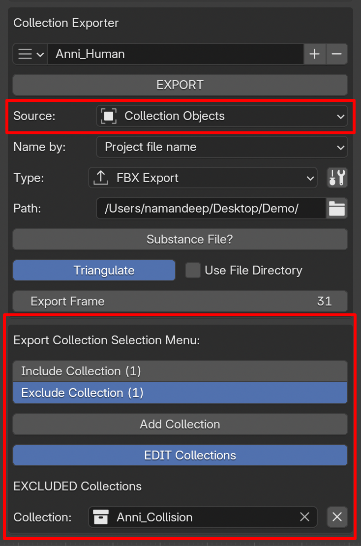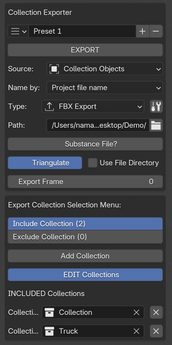 Use File Directory: Saves the file in the File Directory instead of external path provided.Export Frame: Default 0, if changed to let's 10. The final objects/collections will be exported at that timeline frame, Helpful if needed objects at specified frame maybe cuz of required Translation of objects at that frame.
