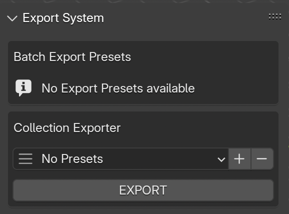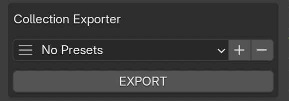 Preset: Select the Preset from the Presets Menu.Name Field: Set the name of current preset. Default:Preset + countExport: If a Preset is selected, Exports the resulting file.(Read below for more details)+:ADD: Adds a new preset for Export.-:REMOVE: Deletes the active preset of Export menu