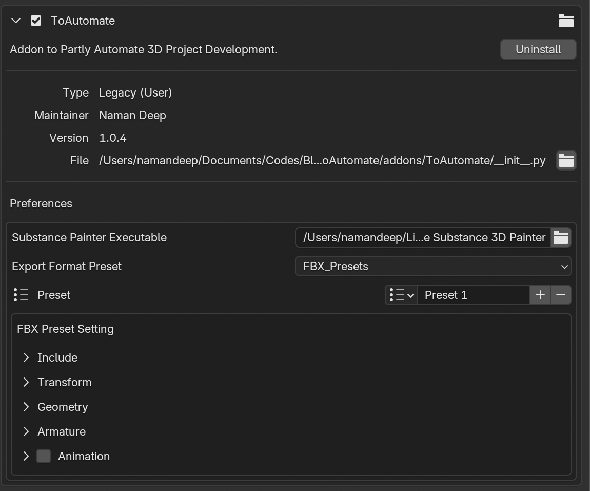 Note: When you leave ToAutomate preferences after creating a preset, make sure, you check which values are selected for Format and Preset of that Format. They become default for new presets in the Addon menu. - Let's say user selected Format Type: